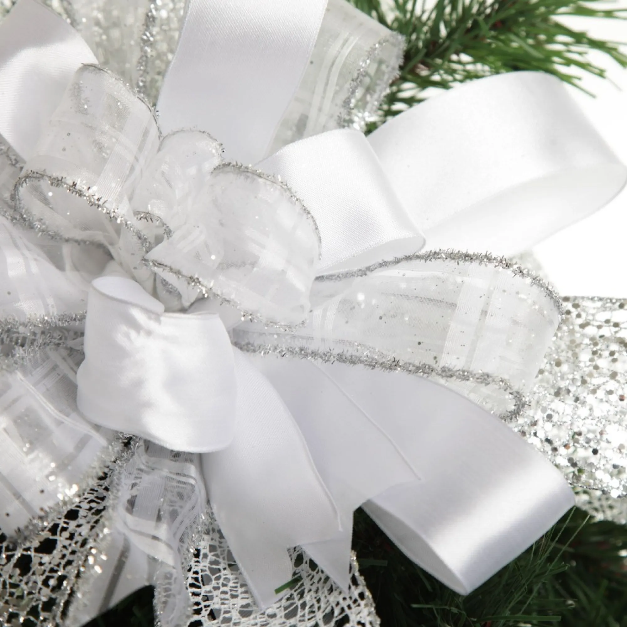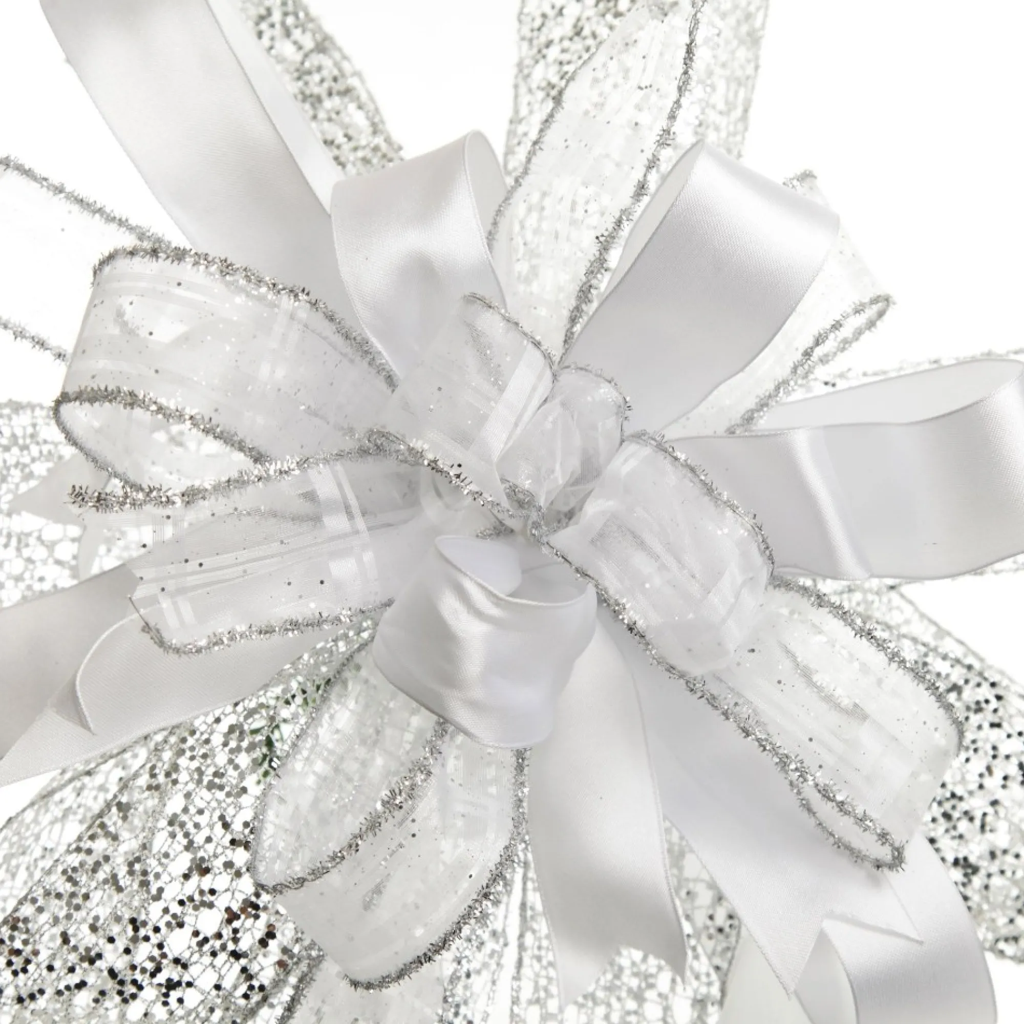 Add Elegance To Your Festive Display With Our White And Silver Glitter Deluxe Tree Topper Bow With Streamers. Featuring A Combination Of 3 Ribbons – Silver Glitter Mesh, White Satin, And Sheer White Plaid With Silver Trim – Hand Crafted Into Intricate Layered Loops Creating A Lush Arrangement. Ribbon ‘streamers’ Hang Down For Added Texture. You Can Use This Unique Bow To Embellish Your Christmas Tree As A Tree Topper, To Decorate A Large Custom Wreath, Or To Decorate Any Door, Wall, Or Window In Your Home. Each Ribbon Is Wired Making It Easy To Place And Arrange When Decorating. Please Note That The Bow Will Arrive Slightly ‘squished’ For Packaging And Shipping Purposes However Due To The Wired Nature Of The Ribbon It Is Easy To Reshape When Decorating.