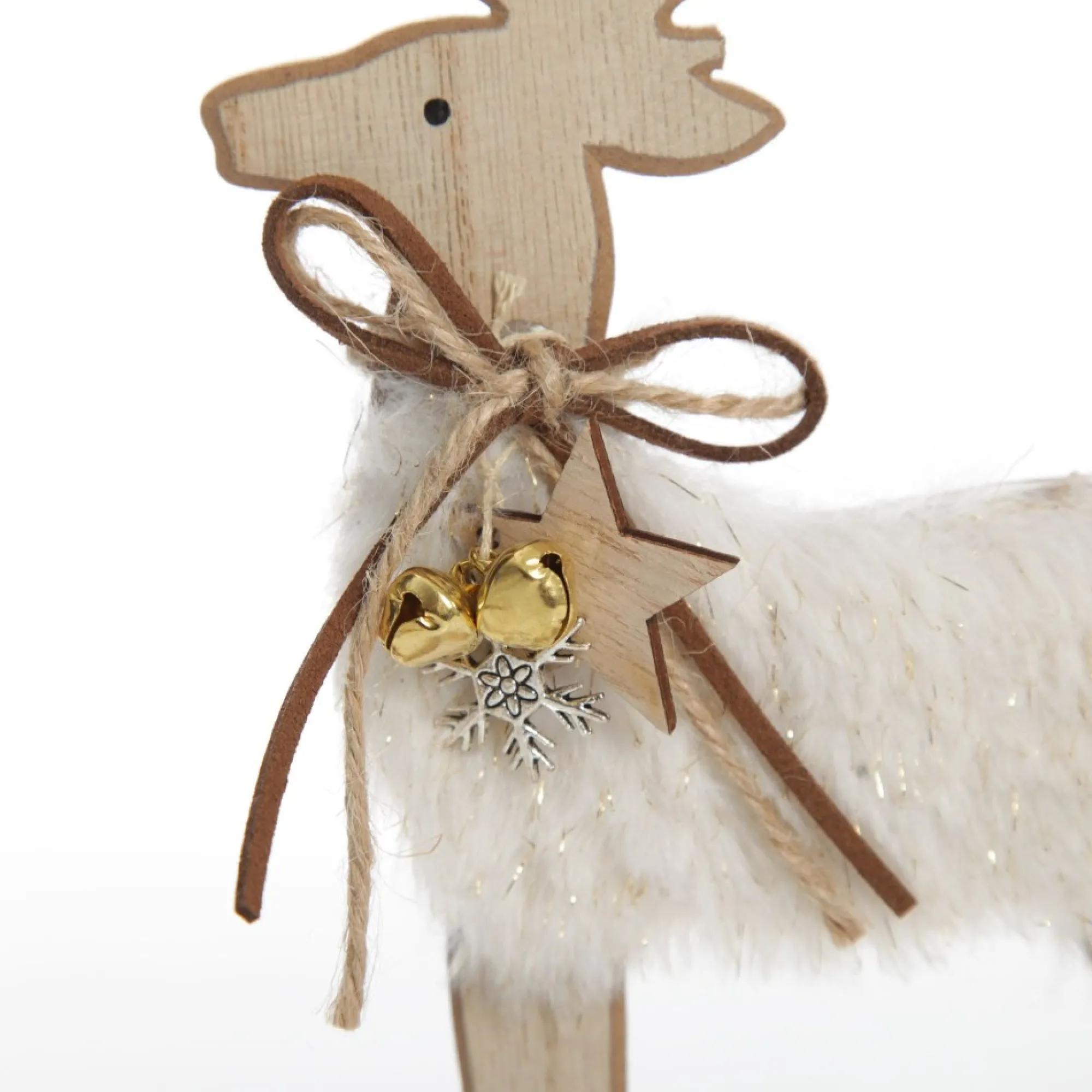 This Charming Wood Reindeer With Fur Christmas Ornament And Neck Tie Will Make A Delightful Addition To Your Festive Displays. Made From Durable Wood Crafted Into An Intricate Reindeer Cut-Out With White Fur And Glitter Detail On The Body And Delightful Wooden Star, Gold Bell, Silver Snowflake And Bow Embellishments Around The Neck. The Flat And Sturdy Wooden Base Makes It Easy To Place And Arrange This Ornament. Display On Any Surface In Your Home As Part Of A Festive Vignette. Use To Adorn Your Mantel, Coffee Table, Dining Table And More To Create A Stunning Centrepiece.